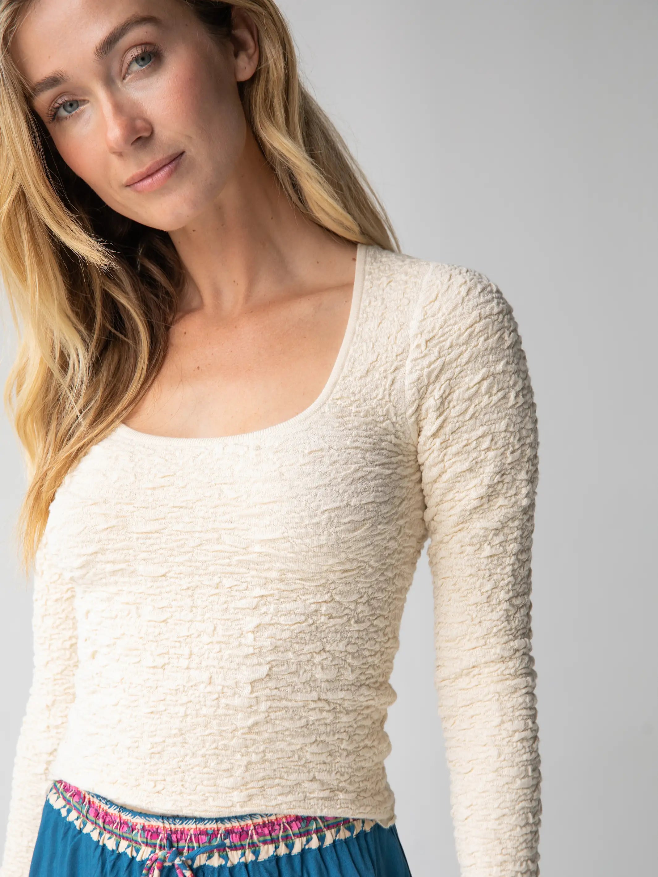 The flattering neckline, soft texture, and long sleeves make it effortlessly cute! It goes with everything!