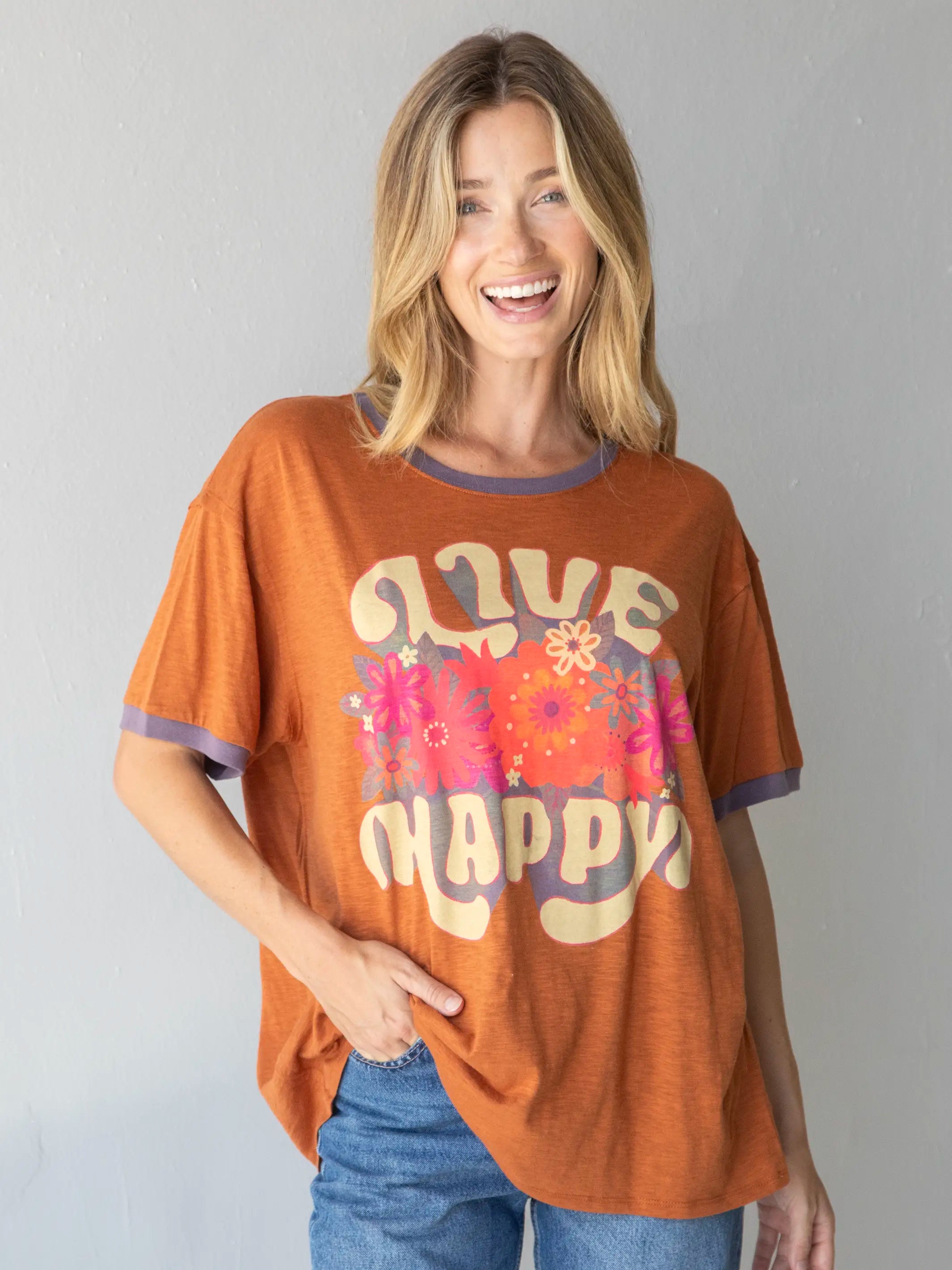 Ringer Oversized Tee Shirt - Burnt Orange Live Happy