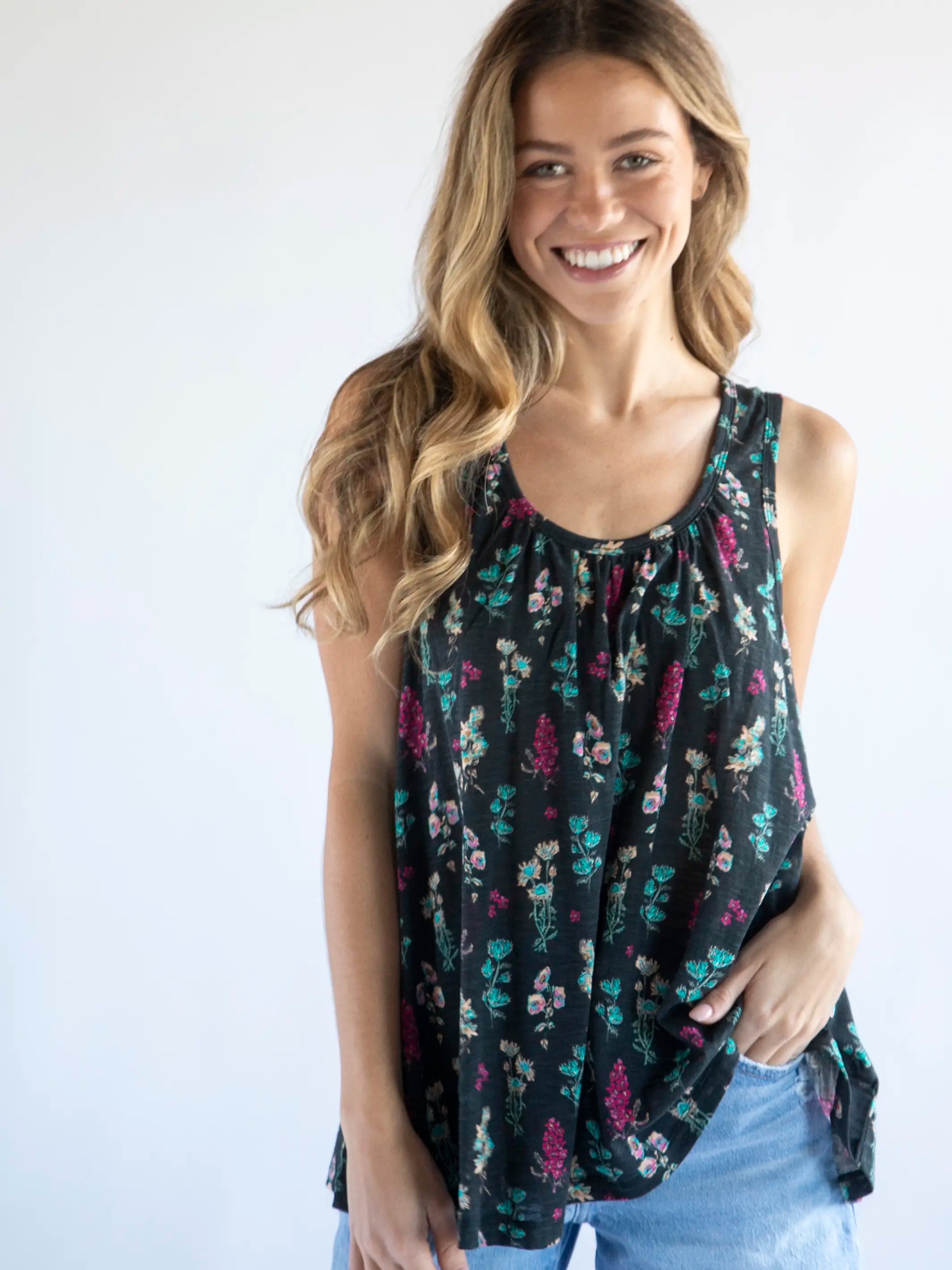 Free Spirit Cotton Tank Top - Charcoal Pink Bouquets